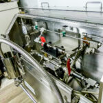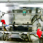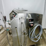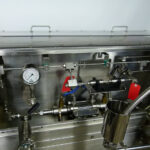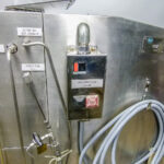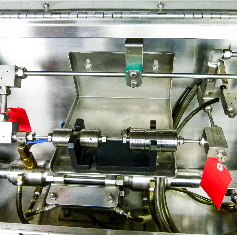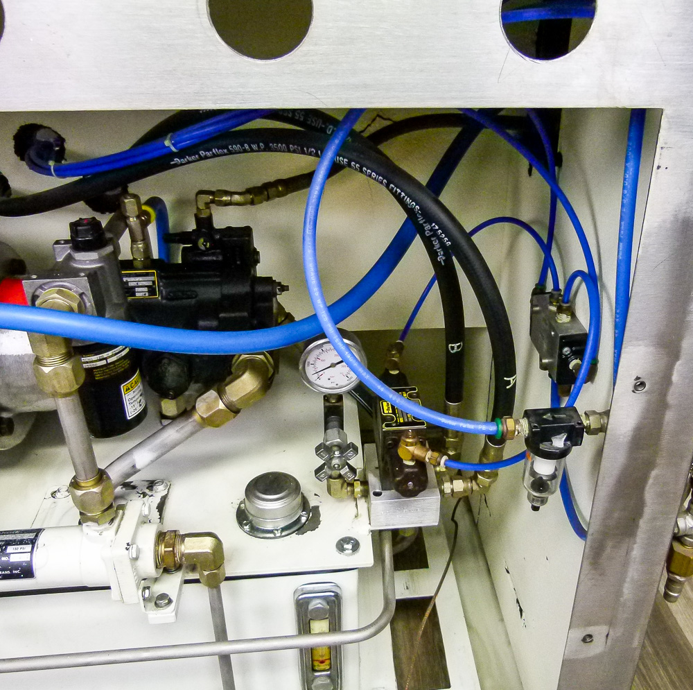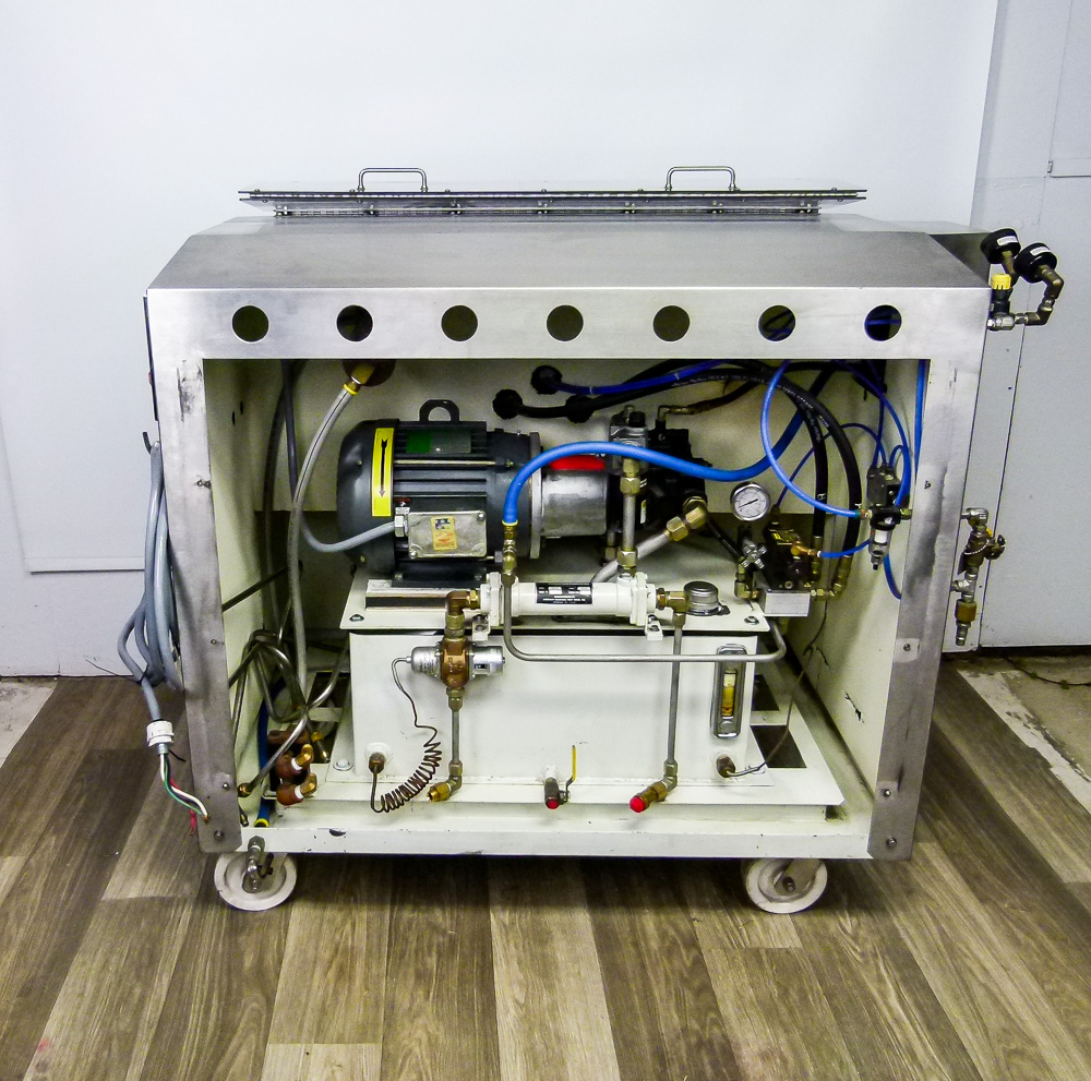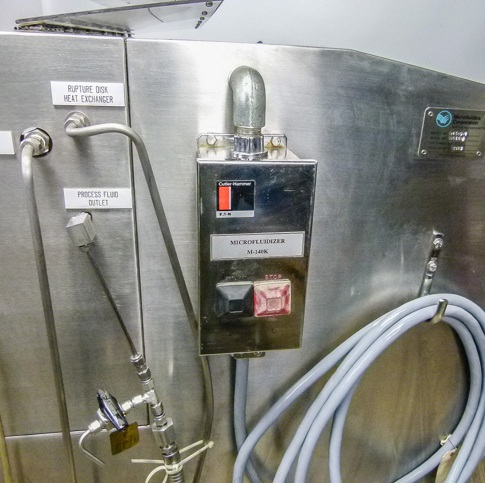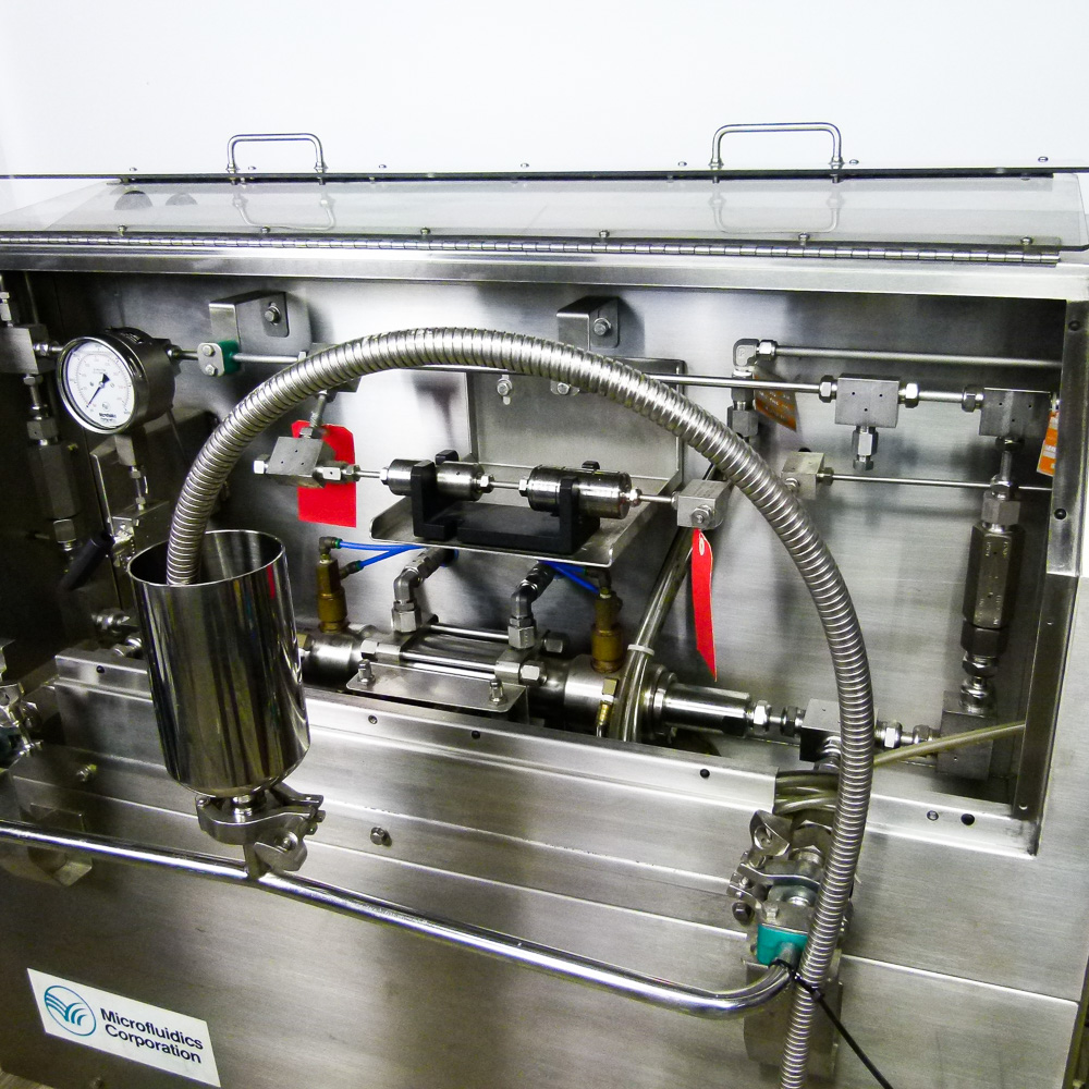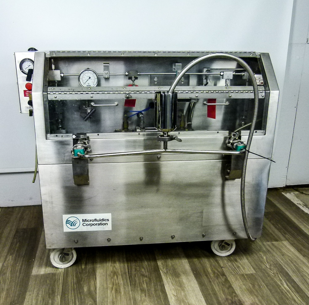 Microfluidics Electric-Hydraulic, Model M140- K homogenizer for sale. This unit is nearly completely stainless Steel for processing in sterile environments. This process-level system is designed for high shear rates which maximizes the energy per unit fluid volume resulting in uniform submicron particle and droplet sizes. It is also designed for inline cleaning. The system also includes a hydraulic motor, on-board heat exchanger and inlet reservoir.